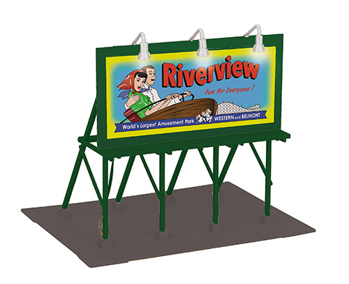 April 2, 2026 - M.T.H. Electric Trains has announced an exclusive and uncataloged RailKing O Scale Lighted Billboard featuring a Riverview Amusement Park advertisement for M.T.H. Authorized Retailer Berwyn's Toys & Trains of Berwyn, Illinois. The billboard will be available in extremely limited quantities beginning in July 2026. Item No. 30-90754 Riverview Amusement Park Lighted Billboard ABOUT THE RAILKING O SCALE LIGHTED BILLBOARD OFFERINGS The fully assembled lighted billboard is premounted on a base for easy placement anywhere on the layout. For those looking for a more prototypical look, the base can be quickly removed and the billboard legs can be easily inserted into soft styrofoam ground cover for a more realistic appearance. The three overhead lamps cast a soft glow on the bright and realistic looking graphics are are sure to make any layout's dark scenes really pop. The lamps are powered by any AC or DC model railroad power supply including the M.T.H. family of transformer's using their accessory ports. M.T.H. offers a variety of O scale buildings that will help you create whatever kind of model railroad world you desire; rural or urban, nostalgic or modern. Fully assembled and ready-to-use, M.T.H. accessories will transform your layout into a world of action in just minutes. FEATURES