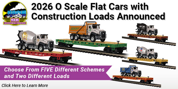 M.T.H. Electric Trains will be releasing the Premier O Scale Steel Caboose in SEVEN different roadnames next Spring. Each item will be limited in production, available in two car numbers, and expected to begin shipping to M.T.H. Authorized Retailers in April 2026. Check out each of these offerings HERE. These items are available to order from your local M.T.H. Authorized Retailer. M.T.H. Electric Trains will be releasing the 2026 RailKing O Scale Lighted Billboards in FIVE different schemes next Spring. The billboards will be available in extremely limited quantities and are expected to begin shipping to M.T.H. Authorized Retailers in March 2026. Check out each of these offerings HERE. These items are available to order from your local M.T.H. Authorized Retailer. M.T.H. Electric Trains will be releasing the 2026 Premier O Scale Flat Car with Construction Load in FIVE different schemes next Spring. The cars will be available with a 1/50th Scale Cement and Dump Truck, each in extremely limited quantities. The cars are expected to begin shipping to M.T.H. Authorized Retailers in April 2026. Check out each of these offerings HERE. These items are available to order from your local M.T.H. Authorized Retailer. |