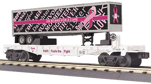 April 3, 2026 - M.T.H. Electric Trains has announced an exclusive RailKing O Gauge Flat Car with 40' Trailer in unique Cancer Awareness livery for exclusive distribution for M.T.H. Authorized Retailers E-Z Catch, and Dixie Union Station. These cars will be available in two unique car numbers, each in extremely limited quantities beginning in July 2026. Item No. 30-76979 Cancer Awareness Flat Car w/40’ Trailer Item No. 30-76980 Cancer Awareness Flat Car w/40’ Trailer ABOUT THE O GAUGE FLAT CAR WITH 40' TRAILER The trailer-on-flat-car, or TOFC, concept actually predates the trucking industry. From 1885-1893, Long Island farmers could ship their loaded wagons to Manhattan markets on Long Island Rail Road flatcars. Teamsters rode in their own coach on the farmers’ specials, while their horses traveled in stable cars.The modern use of railroads to ship loaded trailers began on the Chicago Great Western Railroad (the "Corn Belt Route") in 1935 and became widespread in the 1950s, under the leadership of a former GM executive named Eugene Ryan and early supporters that included the Pennsy, New Haven, Chicago & Eastern Illinois, Burlington, and Southern Pacific railroads. Originally a large number of trailers were railroad-owned, and loading and unloading was done "circus-style" by driving the trailers onto a string of flatcars from one end. A major advance came in the 1960s with the advent of the first side-lift cranes, dramatically speeding up loading and unloading. Today the combination of trailer and container shipments, known collectively as intermodal, constitutes the largest class of freight on American railroads.